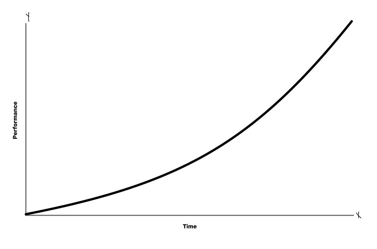 Most people expect a straightforward relationship between time and performance: you put in the work, you get the results, things improve linearly. Reasonable expectation. The right one to aim for. In other words, something like this: